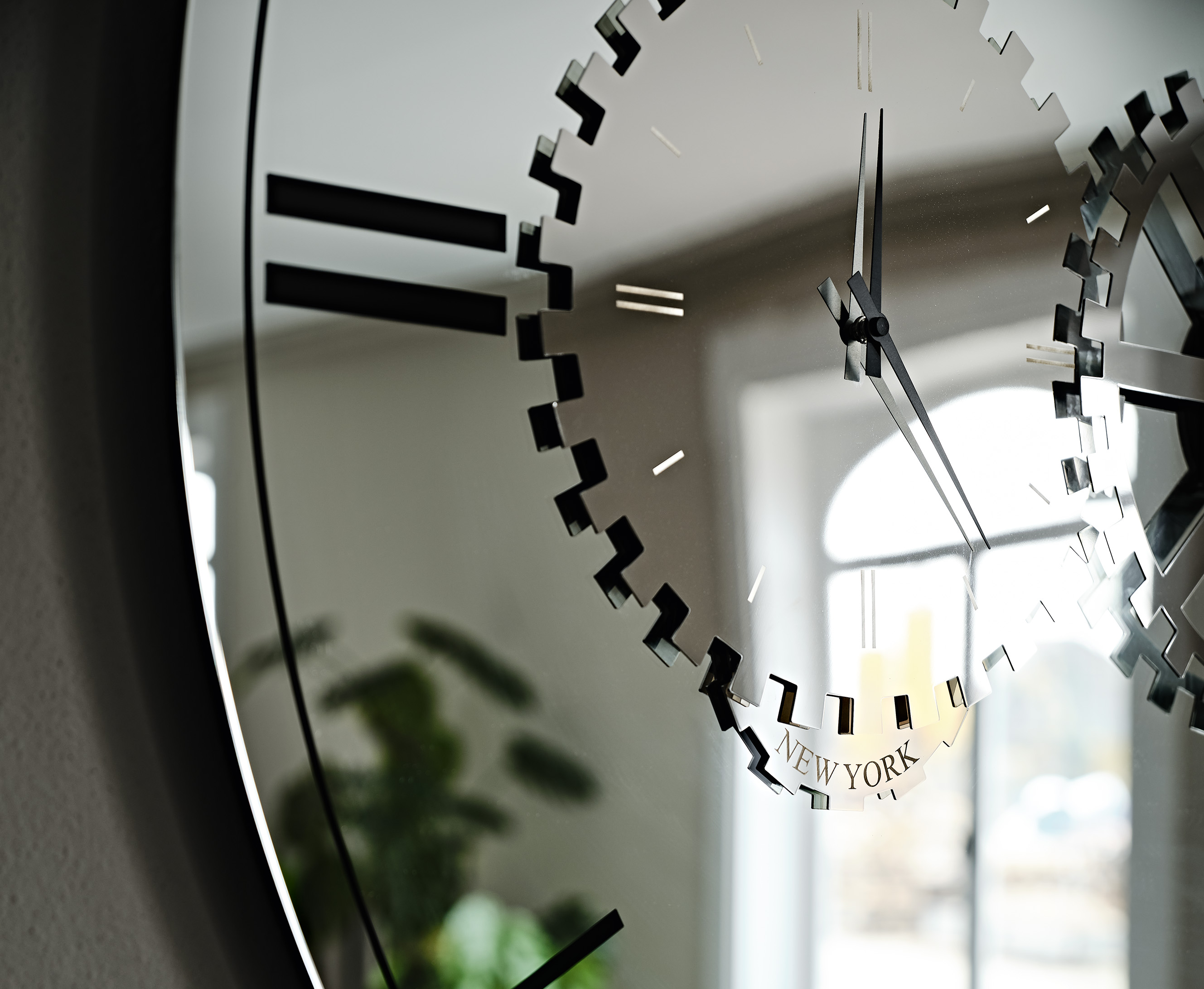 Times(タイムス)は美しく魅力的なミラーと機能性高いモダンウォールクロックが融合した鏡面仕上げクロックです。左側の文字盤はニューヨーク、ロンドン、ローマの時刻を、右側の文字盤はモスクワ、東京、シドニーの時刻を表示します。ディテールはスチール製。シルクスクリーン印刷です。鏡面はミラーガラスとスモークミラーガラス製からお選びになれます。