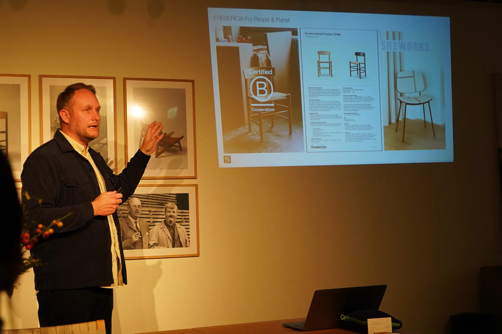 サステナビリティについては、綺麗ごとを言うだけではなく、認定をしっかりとることにし、ようやく取得したのがこのアメリカの認定。デンマークだけではなくおそらく世界中で、この認証の有無は大事にみられるようになってきているとのこと。製造販売において、何かに負荷をかけていないか。負荷をかけた分使われて還元されているか、従業員を心身ともに健康に働かせているか。取引先にも無理な働かせ方をしていないかなど、環境や社会への配慮、透明性や説明責任など、厳しい基準をクリアした企業に対して与えられる認証だそう。