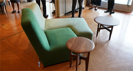 こちら、グリーンの優しい色の張り地に包まれたバージョンの写真は、2022年6月にフランス大使館の貿易投資庁-ビジネスフランスにより開催された”Art de Vivre TOKYO 2022展(フレンチライフスタイル展)”にて撮影したもの。実際にその座り心地の良さを体験できた貴重な機会でした。大胆なデザインは意外にもしっくりと空間に落ち着き、人々を迎え入れる温かさを放っていました。