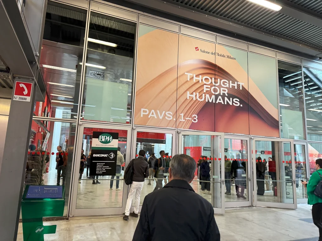 駅から会場までの通路の両脇には例年お馴染みのArchiproductの広告、有名デザイナーの顔写真が並びます。しかしながら私たちが一昨年訪れた2023年には歩く歩道の内壁にも所せましと張り巡らされていたキービジュアルが今回は無く、今回のコミュニケーション・キャンペーン 「Thought for Humans. (人間のための思考) 」のキービジュアルが大きく掲げられたのをやっと見られたのは会場入り口の地上へと上がるエスカレーターの前に辿り着いた時でした。今回のイメージは写真家Bill Durgin(ビル・ダージン)氏によるもの。人間の身体とデザインとの結びつきに再び注目した彼の作品では、持続可能性と革新の象徴である木、金属、布、バイオプラスチックなどとの相互作用を表現しています。会場入り口では荷物チェックと、事前に購入しているチケットのQRコードの読み込みの為に人が溢れかえります。
