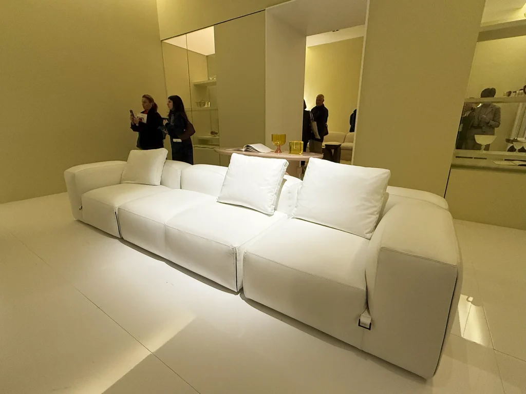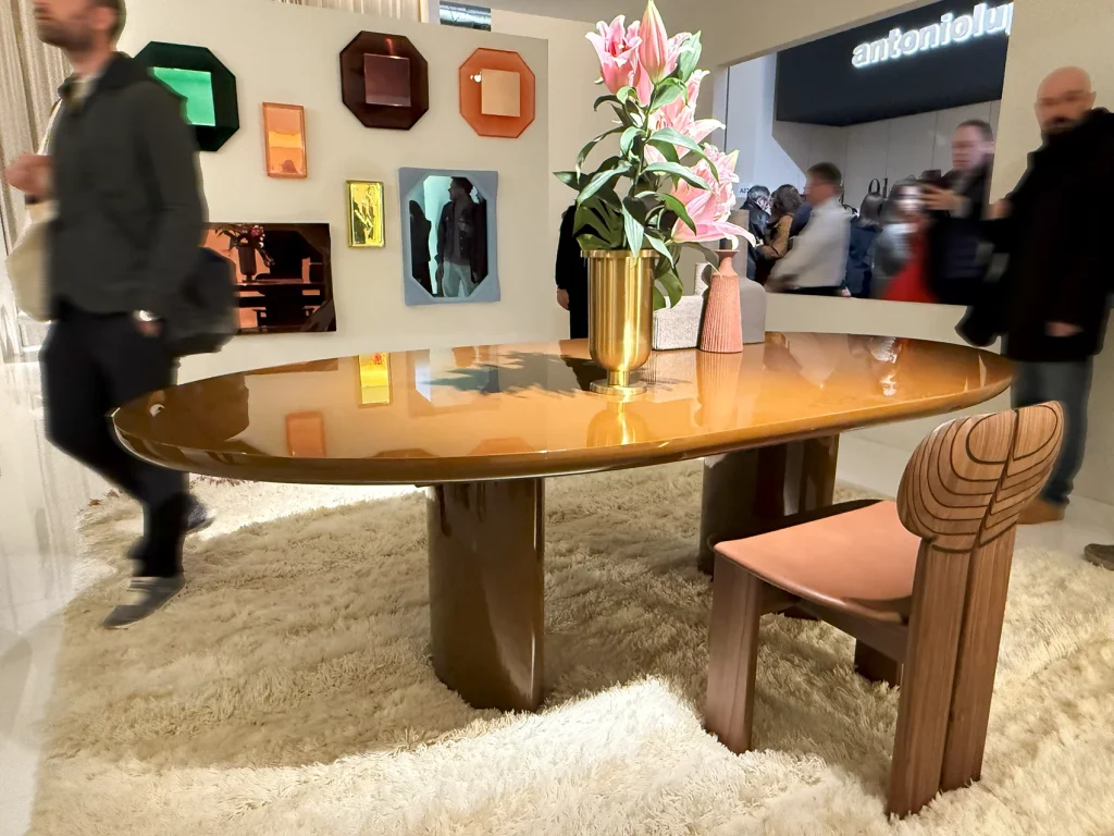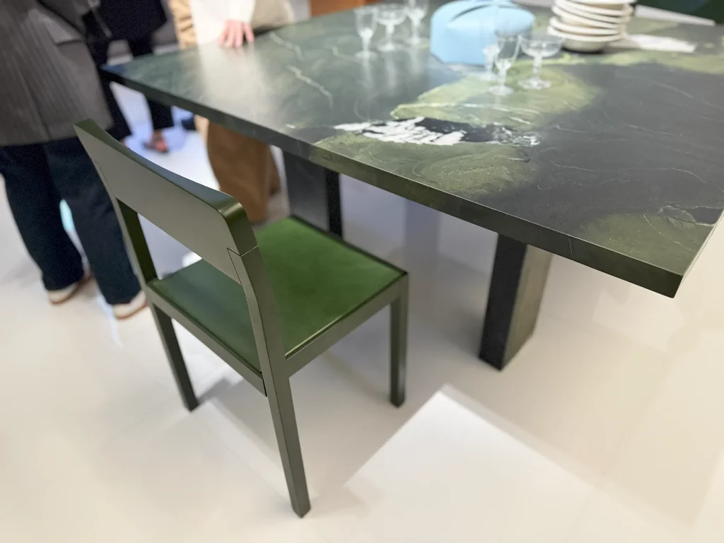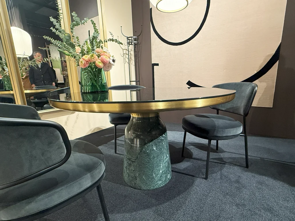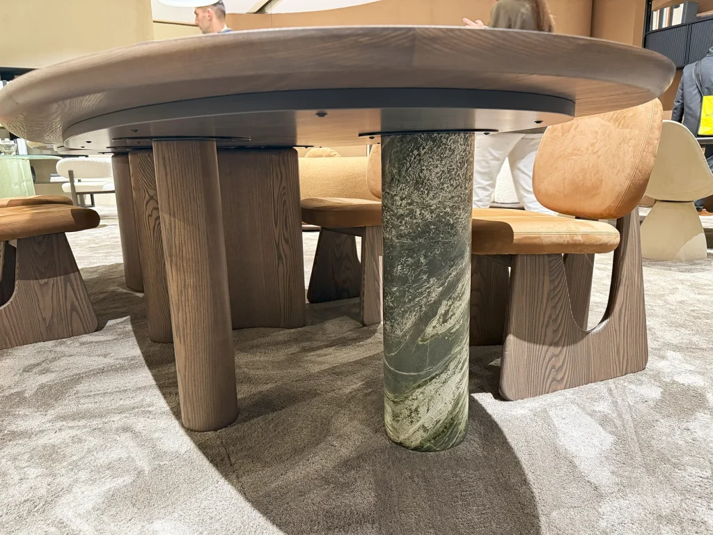 次に、訪問を予約していたHall 22のTacchini(タッキーニ)へ。美しい飴色に光る、Studiopepeによる”TORII LOVE(トリイ・ラヴ) Dining Table”がいきなり目を引きます。そこに置かれたAfra and Tobia Scarpaによる”AFRICA(アフリカ)”チェアが絶妙にマッチしていました。奥の部屋にはマット仕上げのVerde Avocado(ヴェルデ・アボカド)大理石のテーブル”Clockwise”が大きな存在感を放っており、対で置かれた”KLOTSKI”チェアも非常にシンプルなデザインが、その上質さを際立たせていました。木製フレームに布張りの座面で、木そのものの色と落ち着いたグリーンのバージョン、ともに色合いがとても綺麗でした。これらはともにMichael Anastassiadesのデザイン。また、Joe Colomboによる”Additional System”、弊社IL DESIGNのプレゼンテーション・プレイスがある東京デザインセンターのデザインをしたMario Belliniによる”Le Mura”ソファの持つアイコニックなフォルムも見逃せないものでした。