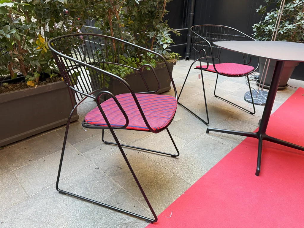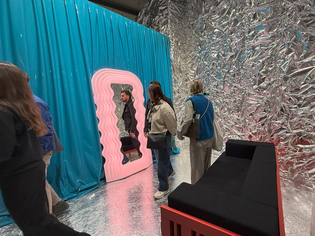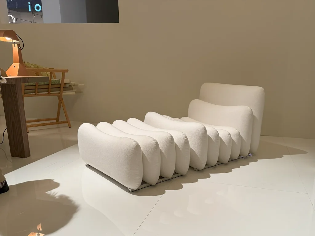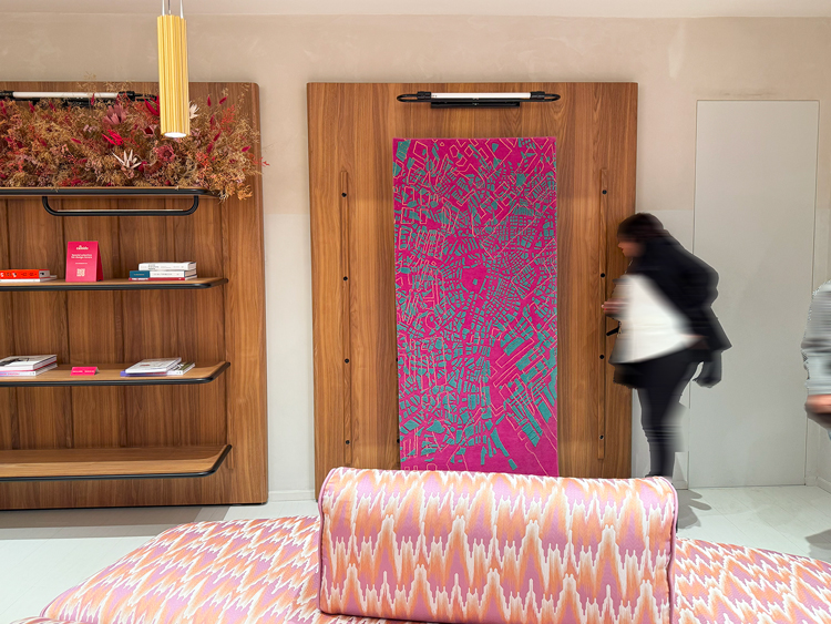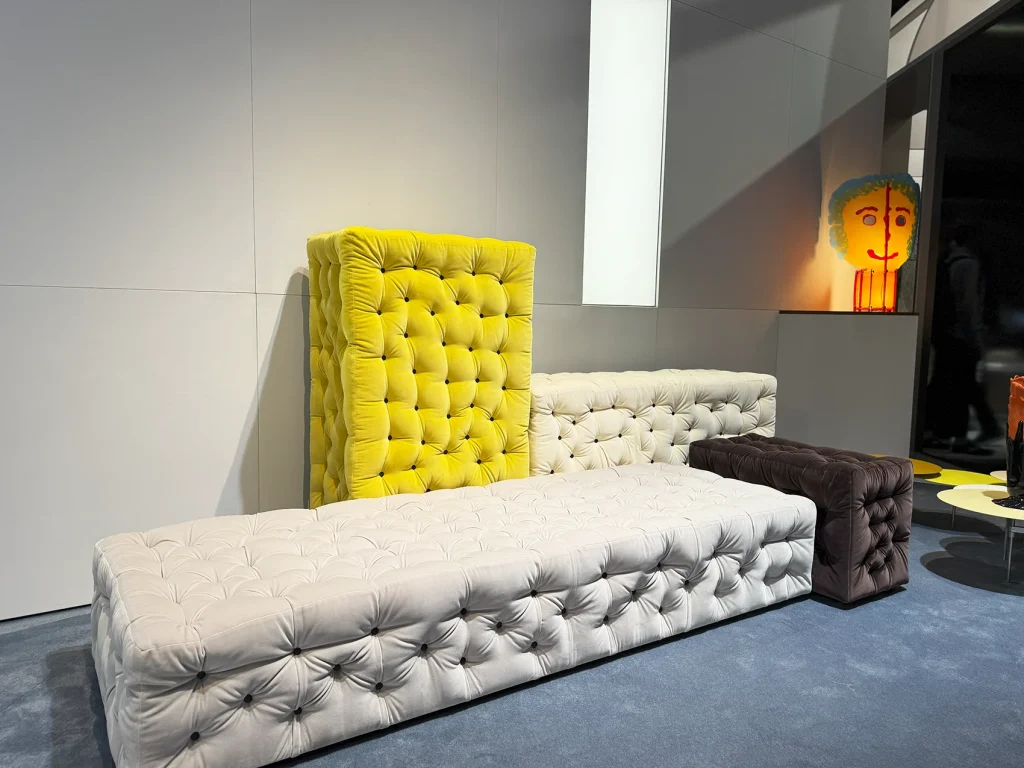 同じく金網の中に、guframと背中合わせに同じく派手な原色を放って作品を披露していたのが、同じくイタリアン・ラディカル・デザイン・グループの傘下で、2023年に復活した革新的なブランドMeritalia(メリタリア)。アイコンであるGaetano Pesce(ガエタノ・ペシェ)デザインの”La Michetta”や”Colorado”などのソファはどこまでも”芸術”であり、子供も大人もわくわくするような大きなおもちゃのようなアートでした。