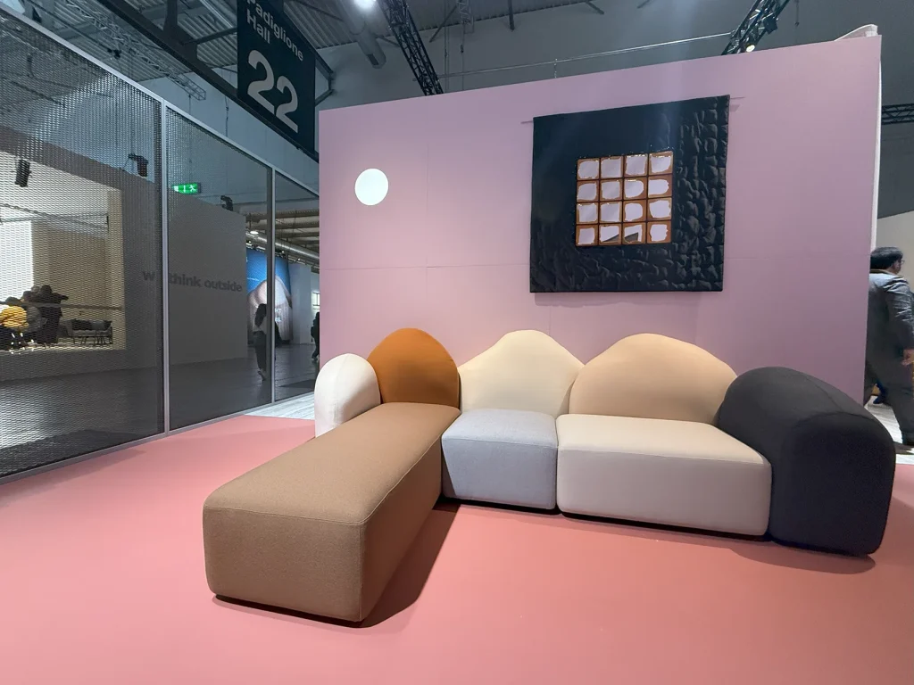 続けてHall 22で廻った中で印象深かったStandをご紹介致します。ClassiCon(クラシコン)のSebastian Herknerによる”Bell Dining Table”が、ベースが大理石になった新バージョンで展示されていたのが圧巻でした。また、受付に並ぶ色とりどりのBell Side TableとBell Side Table Marble達もとても可愛らしかったです。また、弊社が直接取引しているmogg(モグ)の”SKYFALL”はステッチと張地がとても美しくアイコニックなチェアでした。