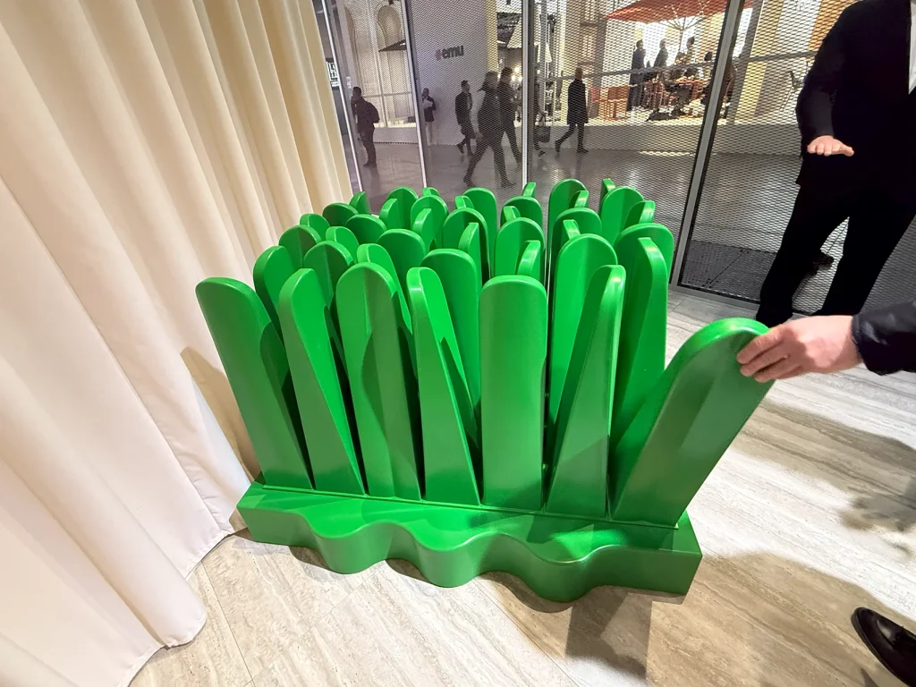 そして原色が眩しいStandが目に飛び込んできました。大きな金網の中に展示されています。gufram(グフラム)の”PRATONE”。柔らかなポリウレタンから手作業で作られた「草」だそうです。1971年にデザインされて以来、芸術的探究の限界に挑戦し続けている”シートデザイン”とのこと。体を投げ出して座る(!?)のだそうです。