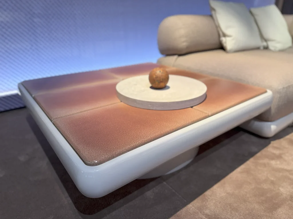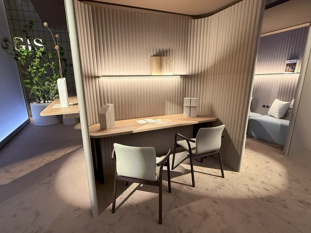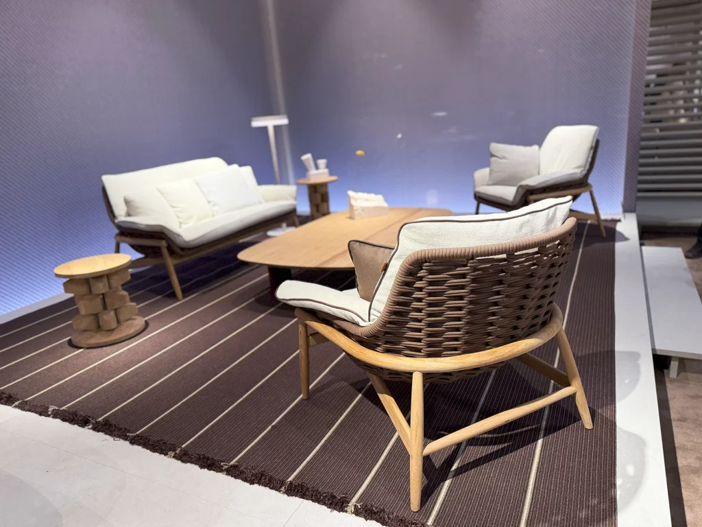 kettal(ケタル)の大きなStandは、今回Patricia Urquiola(パトリシア・ウルキオラ)がデザインしたとのこと。和を感じさせるローテーブル、木と大理石、涼し気なファブリックとの調和が美しいダイニング&アウトドアセット、そして新しいスタイルのワーキングスペースの提案などが統一感のある落ち着いたトーンで展開されていました。