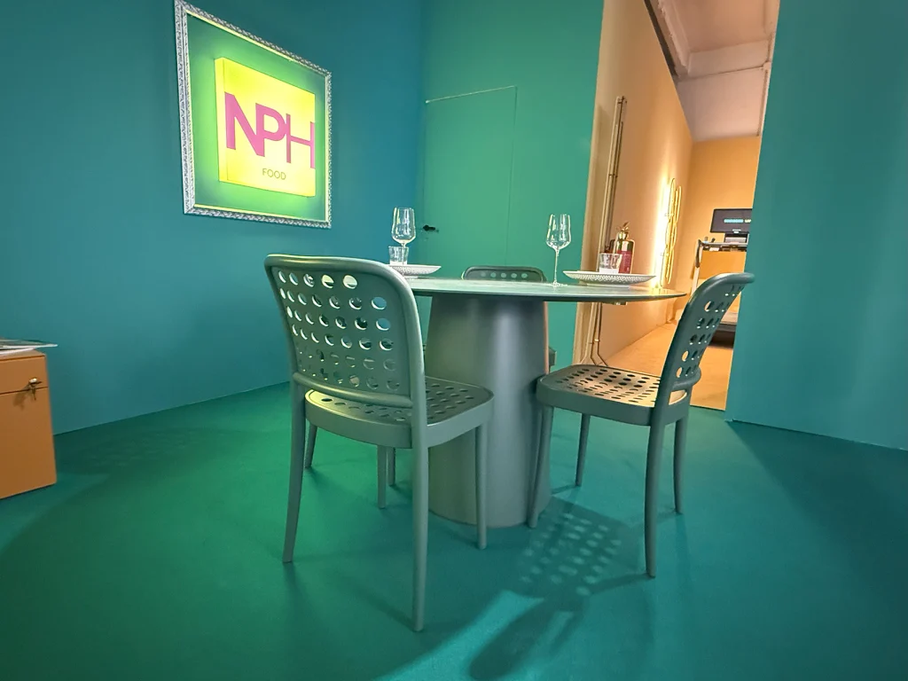 夕方は、運河に近いSavona通りへ。弊社が直接取引をするブランド”TON”(トン)がいくつかのブランドと共に合同展示をしている会場で、担当者Radekさんを訪ねます。ミラノサローネの会場からミラノ地下鉄(赤い色の1線)で一本のミラノのシンボルである大聖堂、ドゥオーモまで出てから車で移動しました。会場は、Cappelliniの創設者でありアートディレクターのGiulio Cappellini(ジュリオ・カッペリーニ)がアートディレクションを行ったという”Next Place Hotel”という場所。TONの新しいポップアイコンである”822 Chair”がDeep Greenのカラーバージョンで展示され、室内装飾ともマッチしてポップ且つレトロ風味なアレンジが素敵でした。