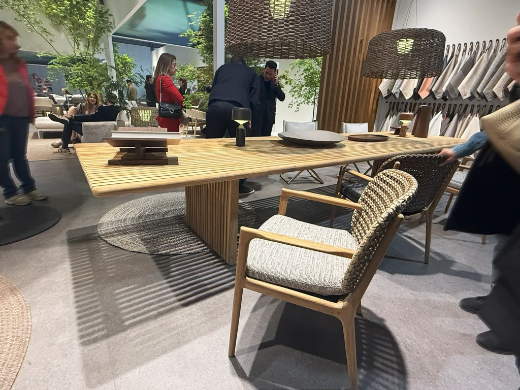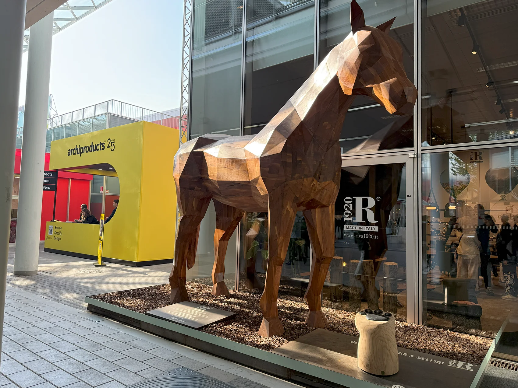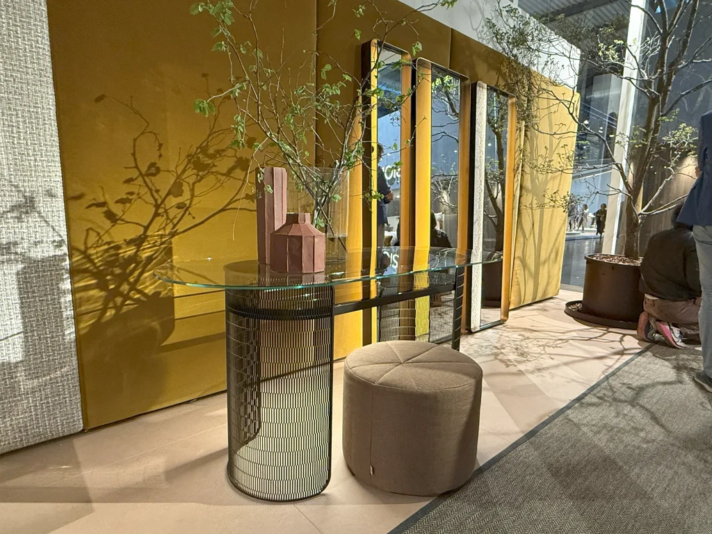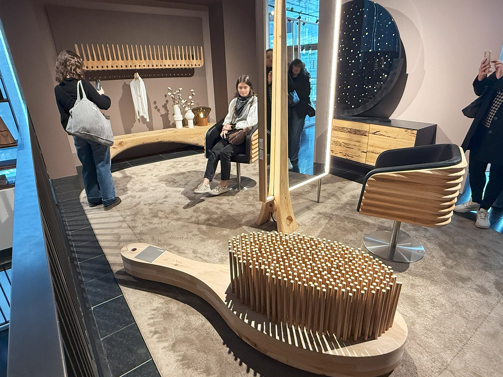 私たちにとってのミラノサローネ会場参加3日目、最終日の本日。まずは今回も別棟の建物一棟丸々使用して展示していたRiva1920(リーヴァ)に入っていきます。Kauri(カウリ)という、ニュージーランドの亜熱帯気候でのみ生育する”森の王”と呼ばれる希少な無垢材を使用した贅沢なテーブルはまさに芸術作品です。また、はりねずみの形の”RICCIO”ベンチや櫛の形のコートラック”LA PETTINEUSE”、ブラシをモチーフにしたベンチ”GIACINTO”などは”Riva節”全開の2025年新作です。”木”という素材に密接に寄り添って制作を続けている彼らのリスペクトを感じました。