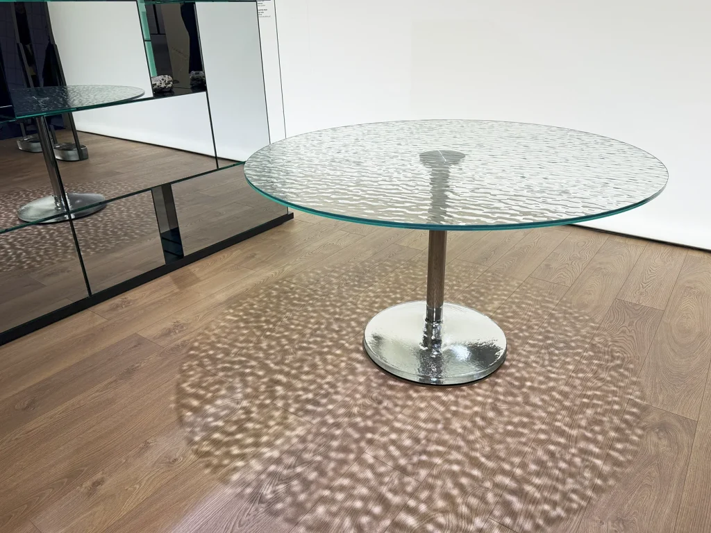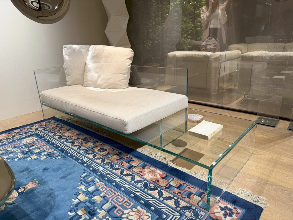 Piero Lissoniによる”Tete-a-tete”、ガラスのソファも静かな衝撃です。また、水面が波打つような表面の層状ガラス天板のテーブル”Contro Peso table”は液体状のガラスを型に流し込んで作る”poured glass(流し込みガラス)”を使用しています。会場初日に訪れたNature Designで撮影した”Blue”のようなテクスチャーキャストガラス(鋳型にガラスを乗せ窯の中で熔かし、表面に鋳型のテクスチャーを施したデザインガラス)製のものなど、今年のミラノサローネでは全編を通してこのような工夫を凝らしたガラステーブルをとても良く目にしました。今のトレンドと言えるでしょう。