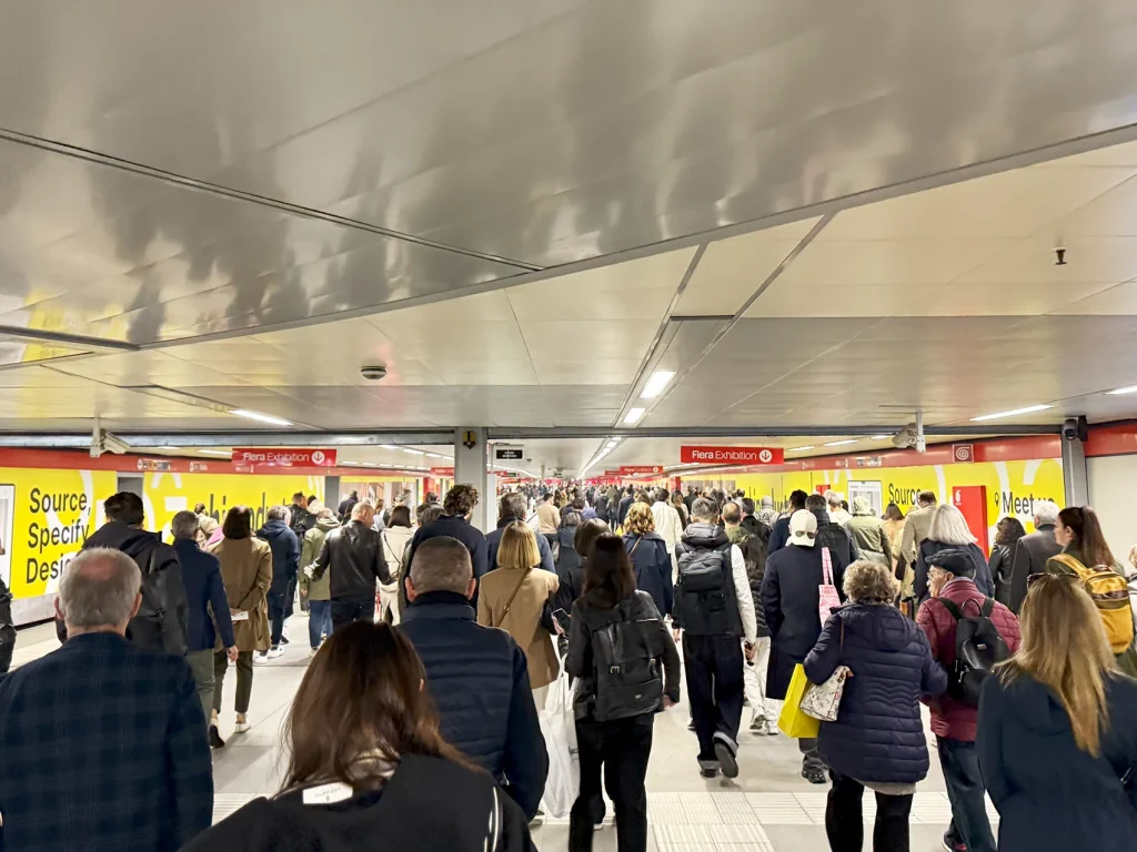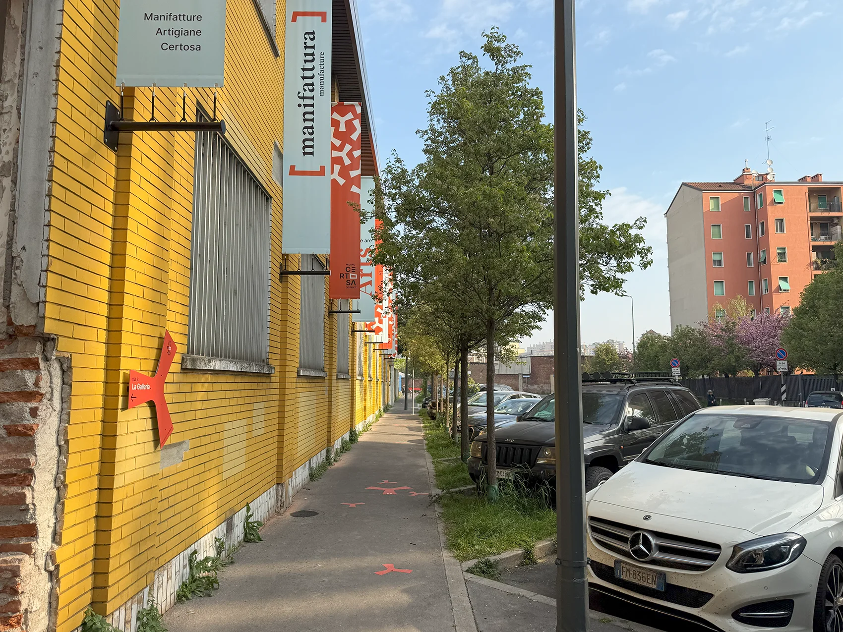 ミラノサローネ会場2日目は滞在中のホテルから徒歩でCertosa(チェルトーザ)駅へ。道中、この地区でもDesignイベントが行われていることがわかる看板や路面ペイントがありました。Rho Fiera Milano駅から会場へ向かう通路は1日目より人が増えた感覚。