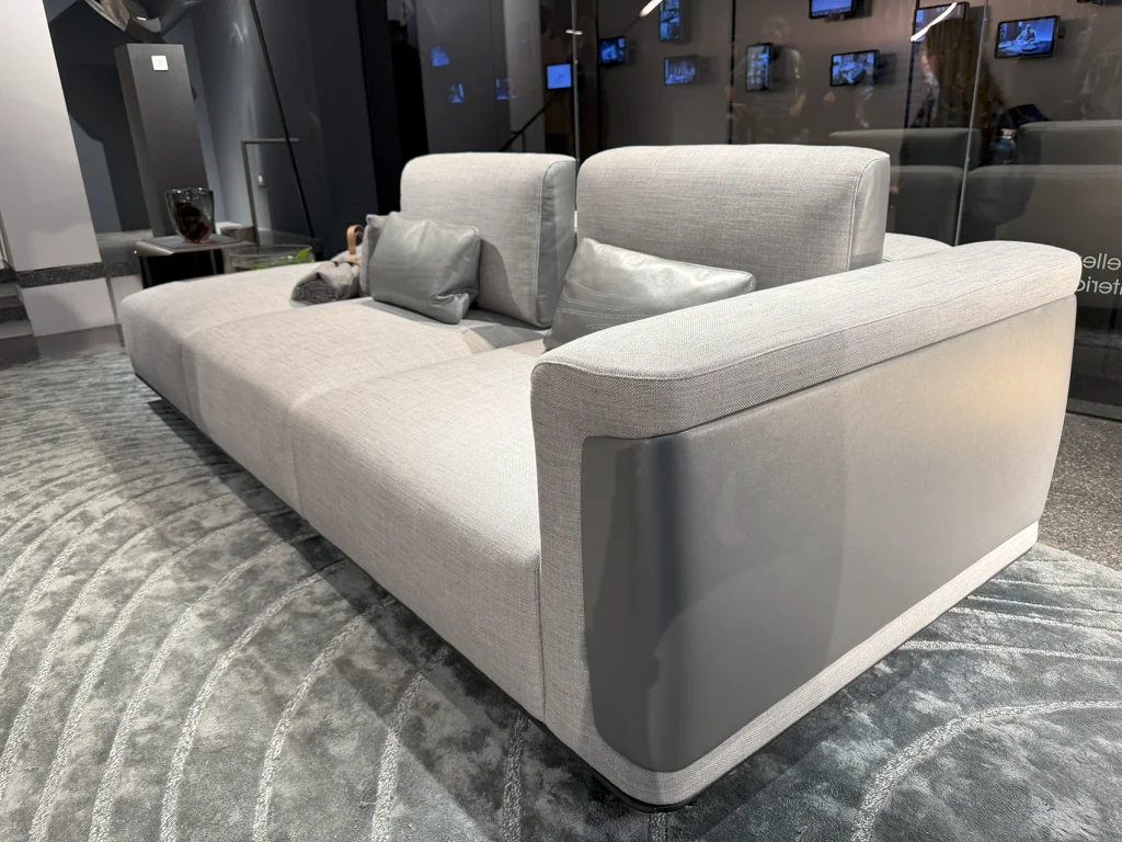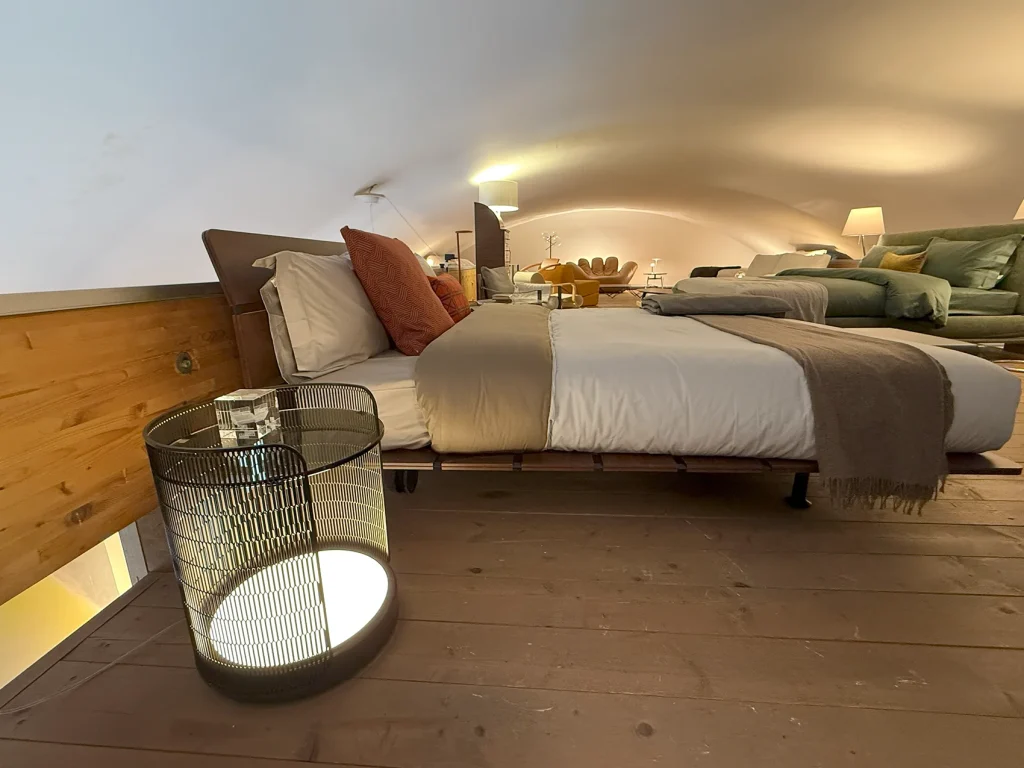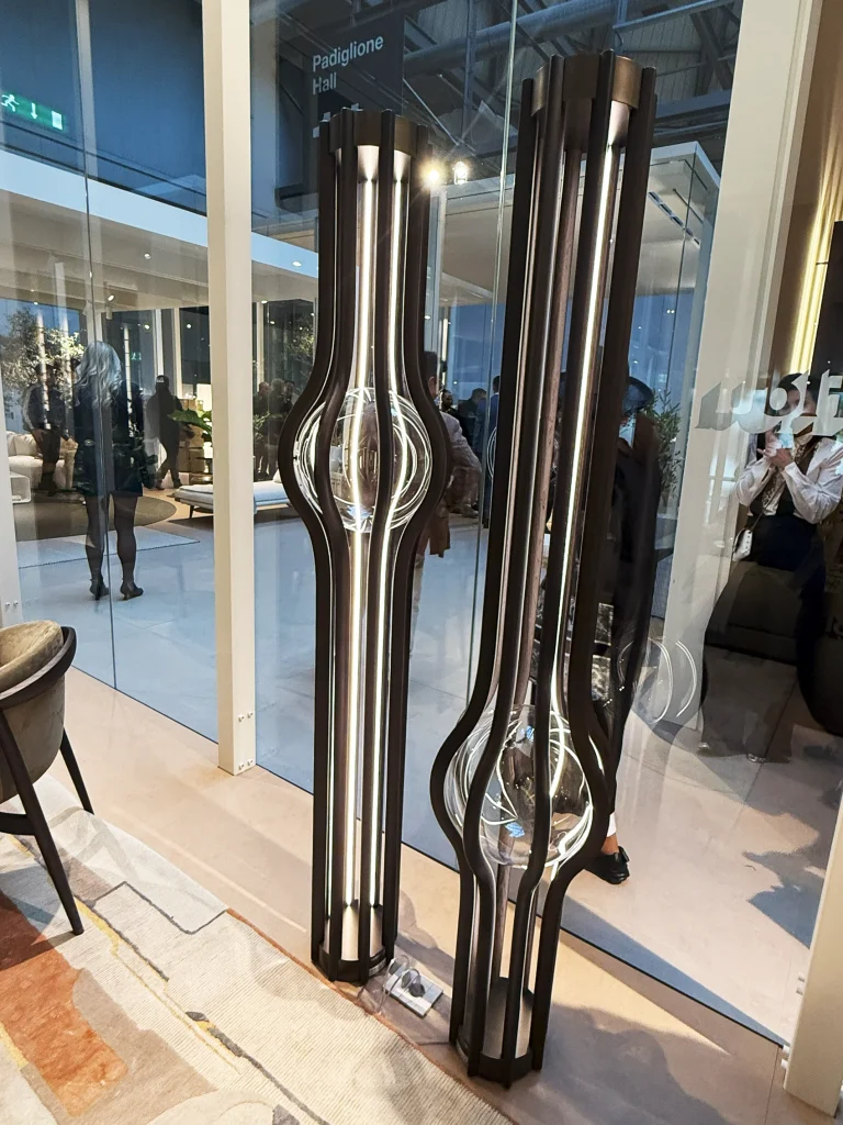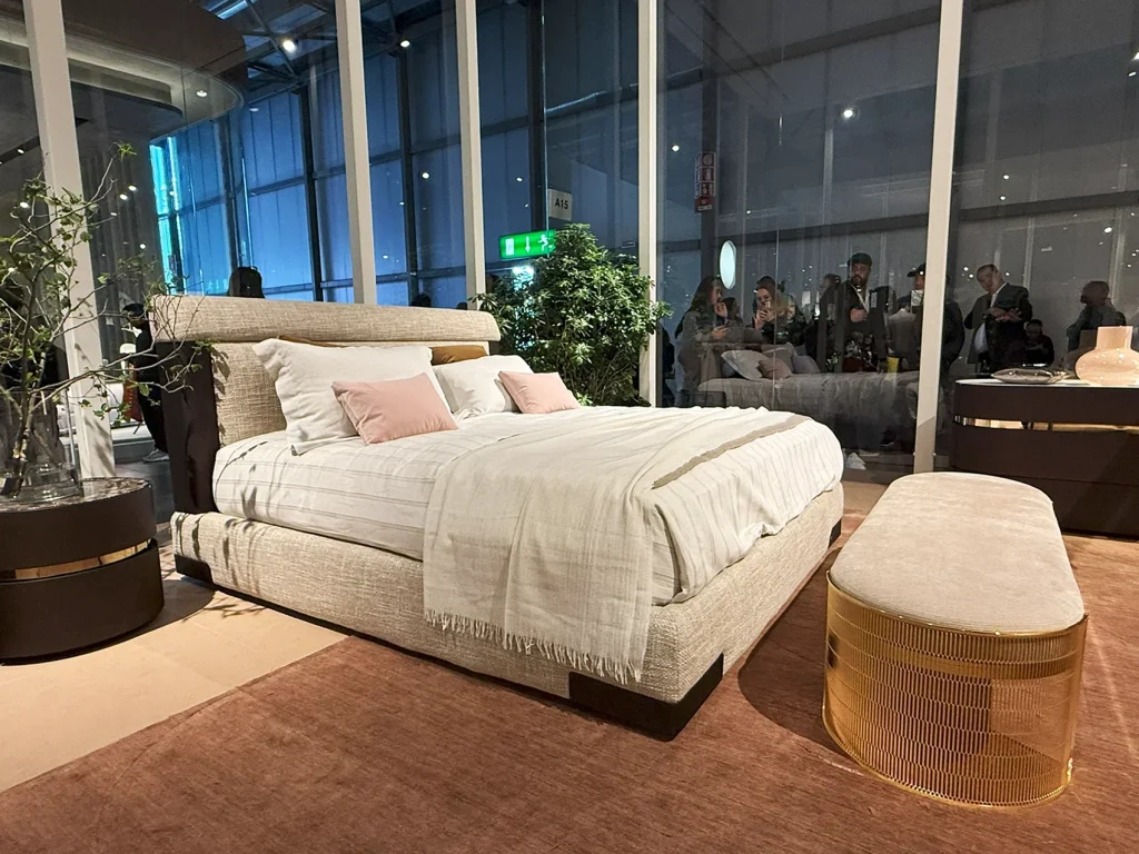 Hall 11のFlou x NATEVO(フルー x ナテヴォ)を再訪問。今回も巨大なスペースに新作が目白押しでした。”Elia”ベッド、”Madame Butterfly”アームチェア、NATEVOの”Ashaa”ランプなど。”Chiaro di Luna”ベッドサイドテーブルは曲線を描くワイヤーメッシュ構造でガラスと大理石が使用されており、サイズ展開や色合いも豊富で新しいスタイルの提案を感じました。Carlo Colomboによる”Toshi”は日本語の「都市」から来ており、現代都市の垂直性と調和にインスピレーションを得た”new sleeping group”とのこと。