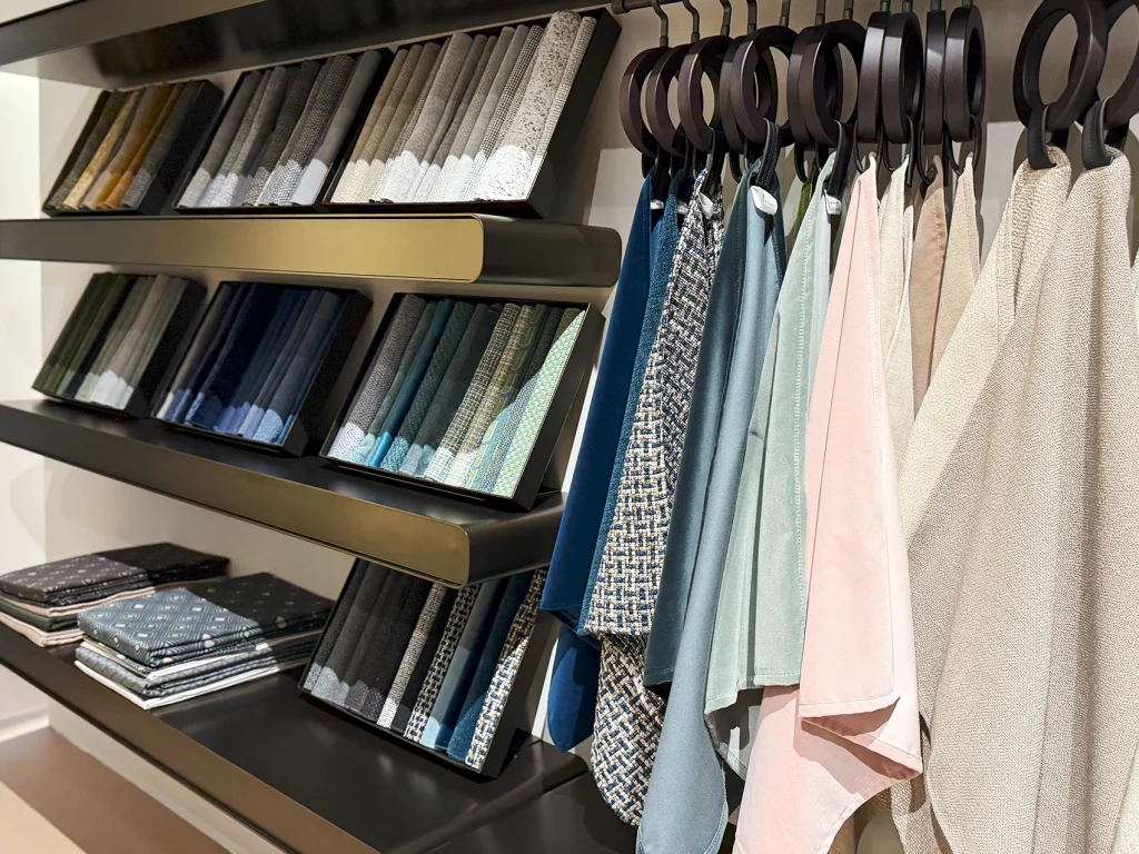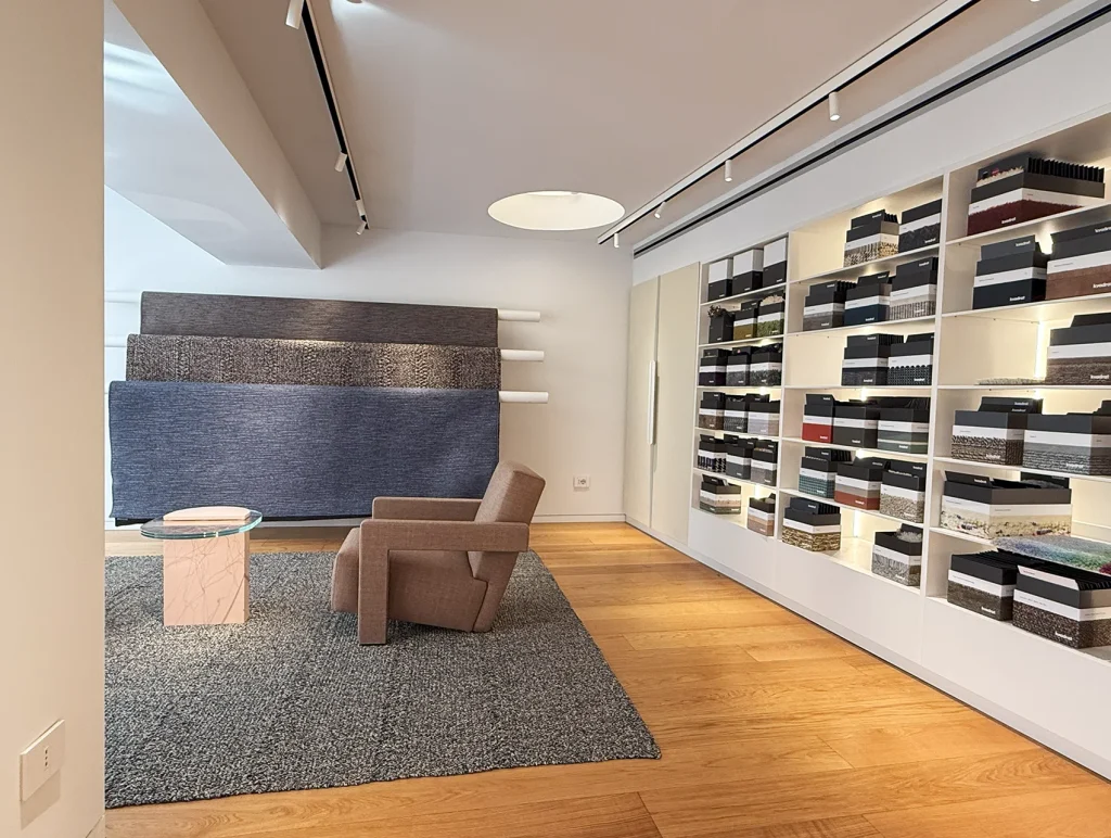 ミーティングスペースでは豊富な張地も直接見られるようになっていました。10年以上直接取引のあるFlouの国内唯一の正規販売代理店である弊社でも、常にこれらの新しい張地を更新し、プレゼンテーションプレイスにてお見せしたり貸し出したりすることができます。お気軽にお問い合わせください。