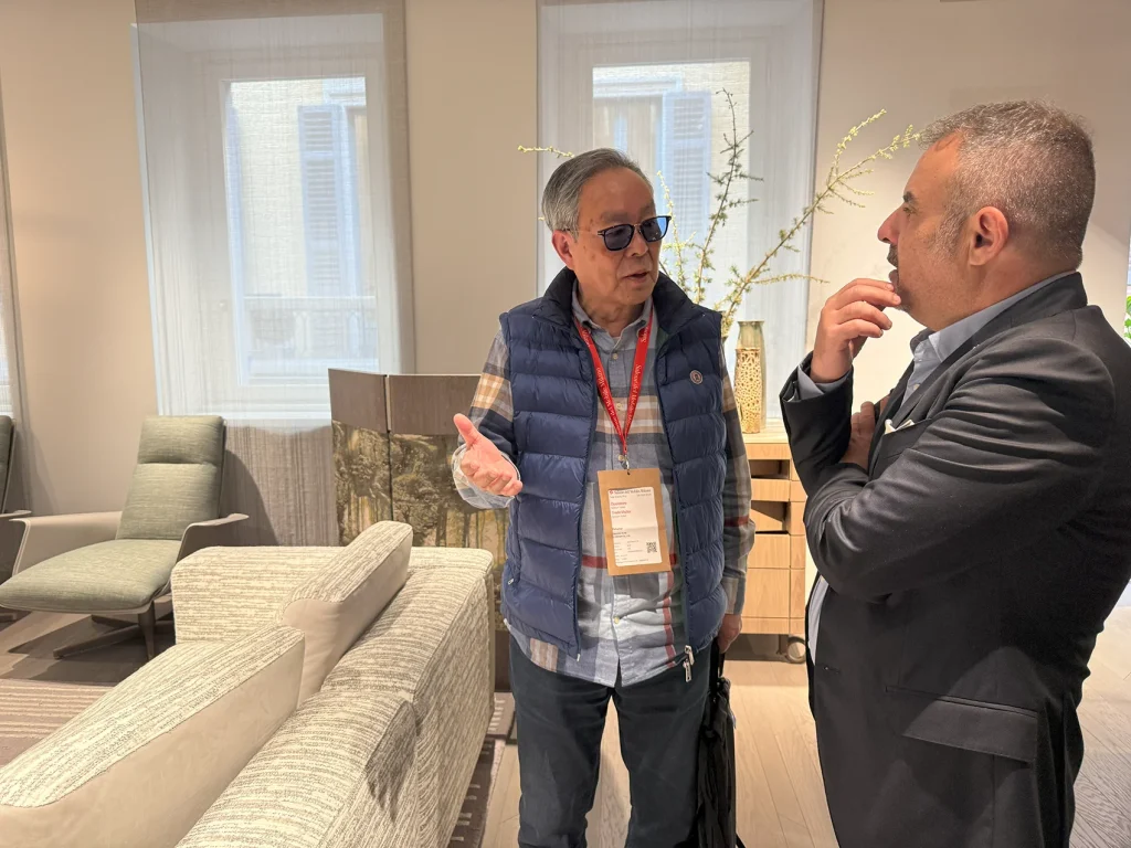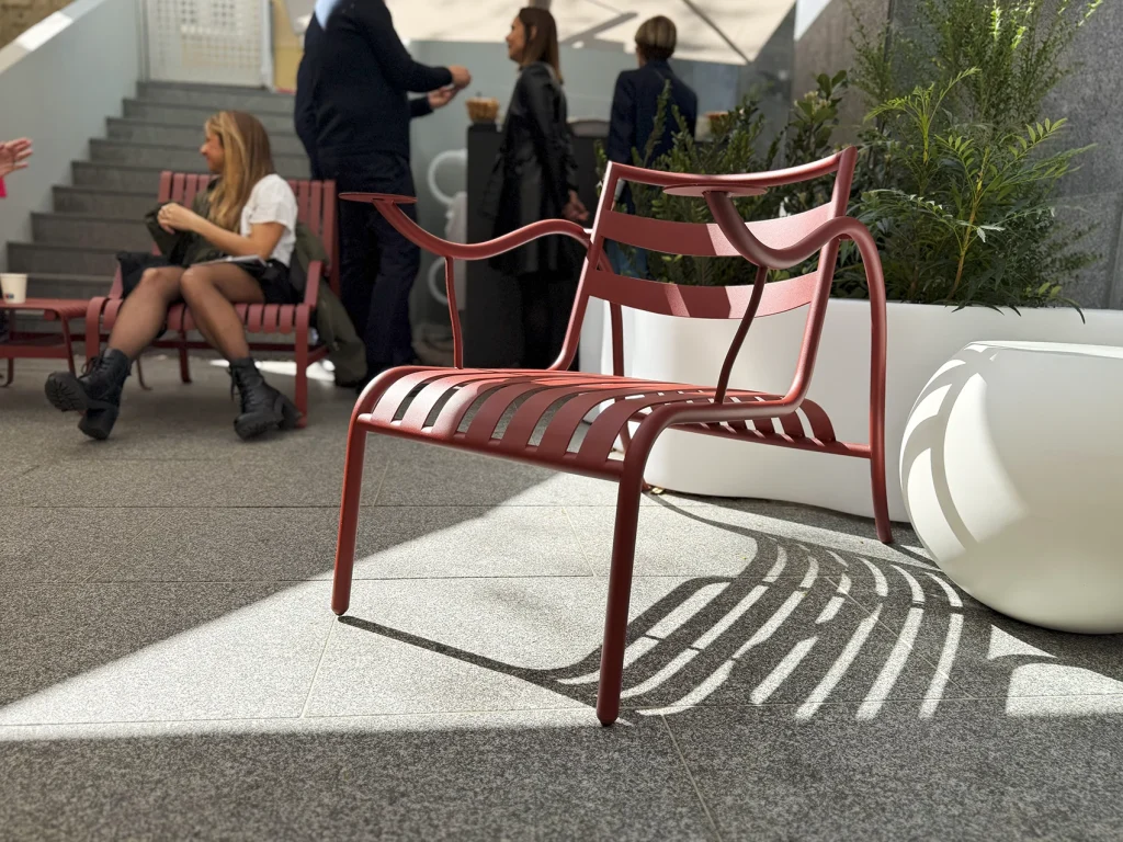 前回来訪時にThinking Man’s Chairを撮影させていただいた建物の中庭は、今年はレイアウトもガラリと変わり、来場した関係者達が思い思いにくつろいだり商談したりなどをして過ごす、賑やかな空間となっていました。日本がとても好きだというCappelliniのスタッフの方が声をかけてくださり、コーヒーと手作りのブリオッシュをいただきながら(とても美味しかったです!)人々の合間を縫って今年も撮影をさせていただきました。