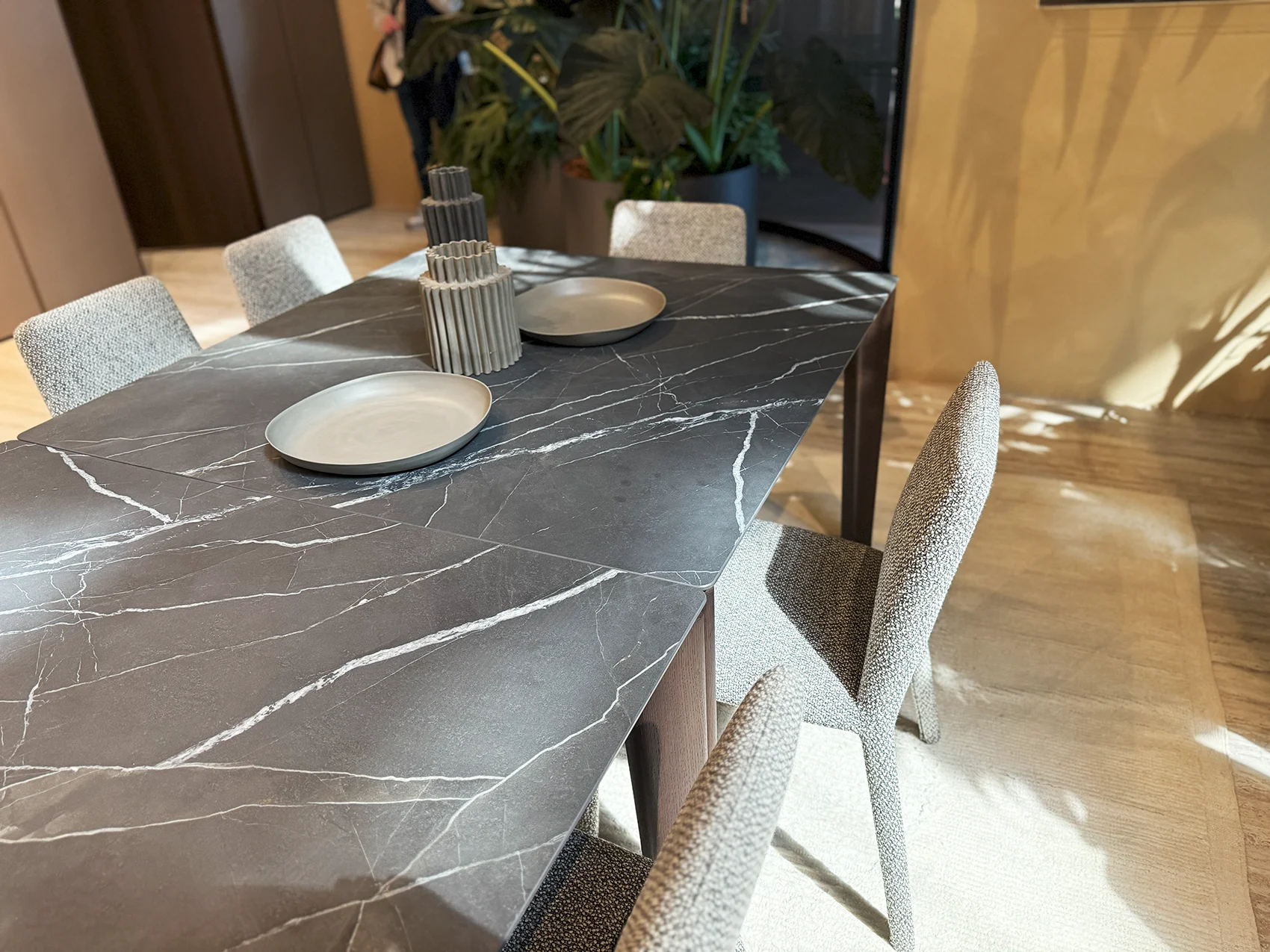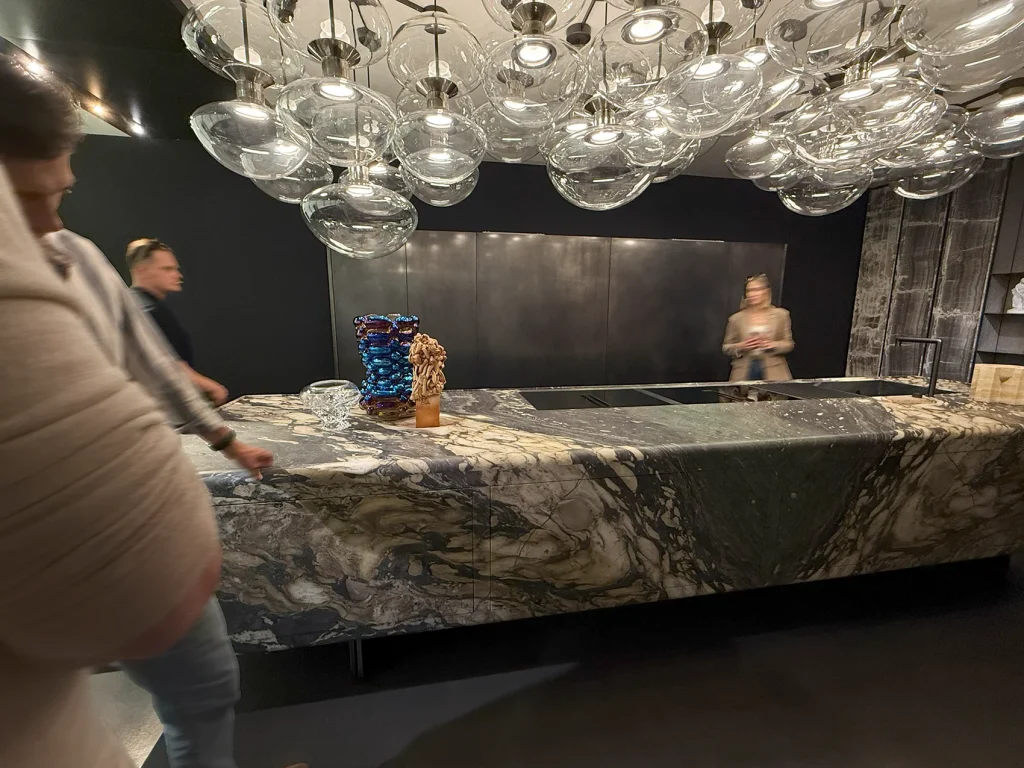 そのままモンテナポレオーネ方面へ歩き、HENGE(エンジ)のショールームへ。彼らは徹底した”素材研究”に根差したブランドで、世界中から探し求めた特別な”素材”の特性を活かす製造工程に力を注いでいるとのこと。繊細な職人技からなるテーブル”Oxymoron”のWalnut無垢材を融合した天板のモザイクパターンは一つ一つがユニークで、二つと同じものはないそうです。また、Ice Onyx大理石のアイランドキッチン、”Oneon”の存在感は人々を釘付けにしていました。