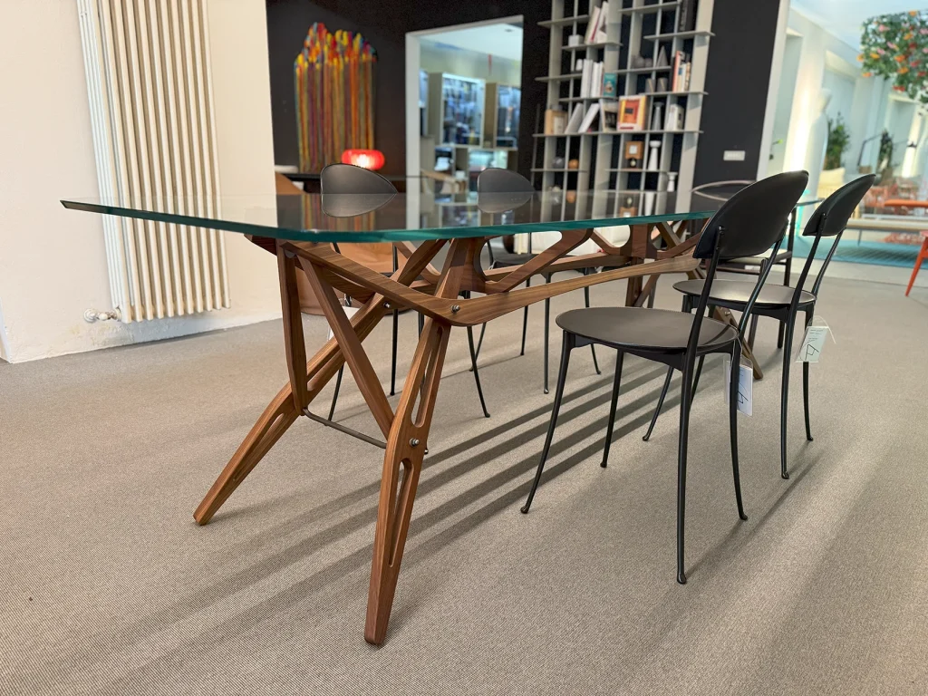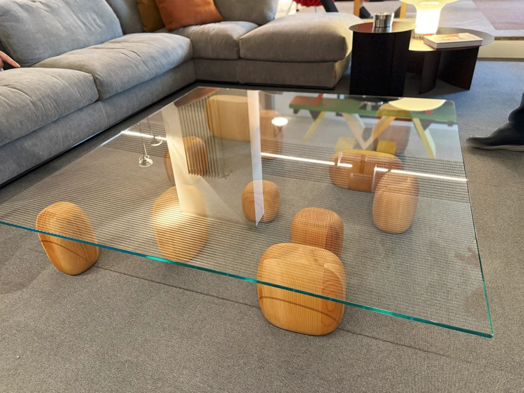 奥のランダムな杭とガラスのローテーブルは”VENICE”