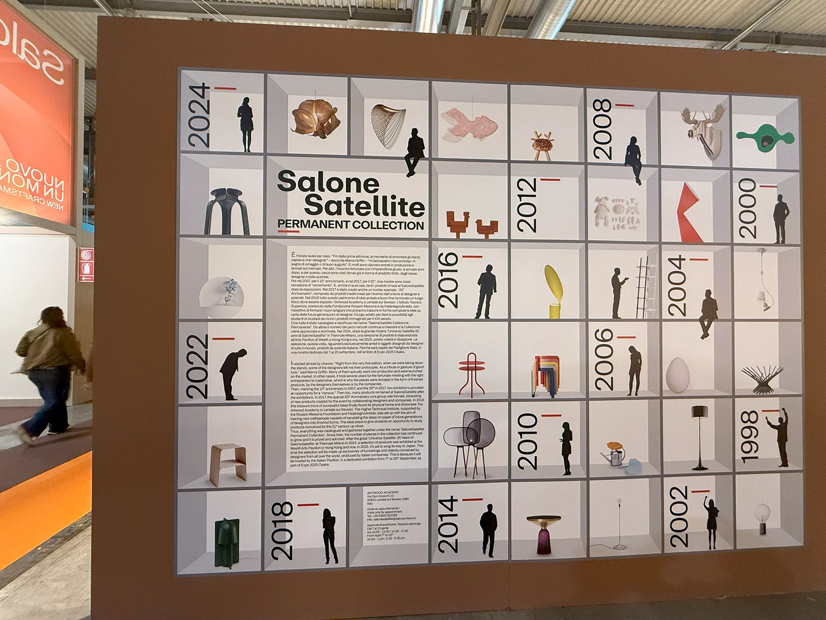 また、今回は35歳未満のデザイナーに特化したイベント第26回「SaloneSatellite(サローネサテリテ)」にも足を運びました。若きデザイナーたち自らが、小さな部屋のようなそれぞれのブースに立ち、緊張しながらも訪問者に一生懸命デザインの説明をしている姿がとてもフレッシュで素敵でした。Salone Satellite Permanent Collectionというパネルには、過去、このSalone Satelliteから排出されたデザイナー達の名作が描かれており、実際にこれらの作品は会場のあちこちで見受けられましたので、今回出展している新しい才能達の作品も未来のミラノサローネの会場中で花開く姿が想像でき、デザインの登竜門的立場であるこのスペースが輝いて見えました。