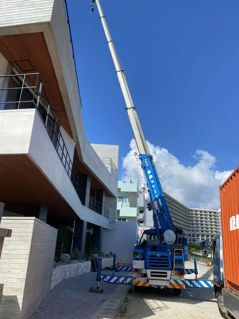 貨物はヨーロッパから東京港へ到着後、内容を確認し、コンテナで沖縄まで輸送。搬入はほとんどの荷物をクレーンで2階、3階へ搬入しました。建物とビーチの間に車両が侵入できるスペースがあり、ベストな位置へクレーンを配置することが出来、結果的にこれが相当な時間短縮につながりました。