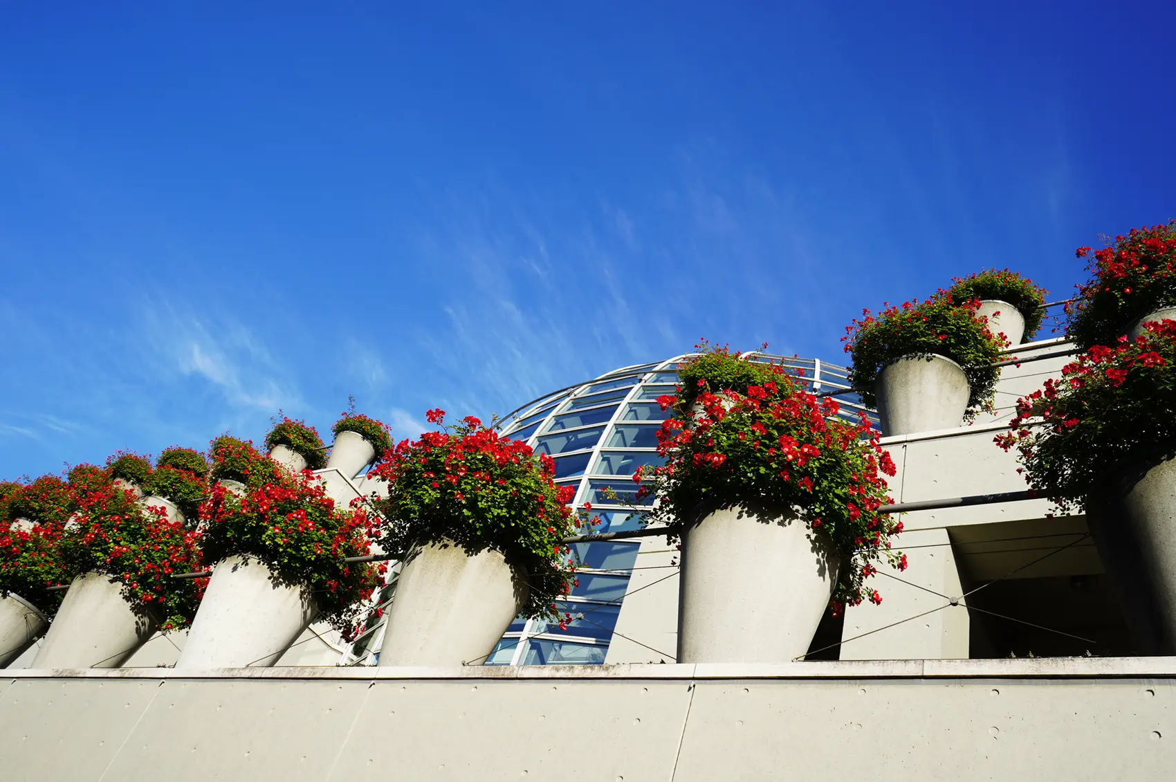 弊社IL DESIGN(イル デザイン)のプレゼンテーションプレイスがございます、ここ東京デザインセンターはイタリアデザインの巨匠、Mario Bellini(マリオ・ベリーニ)がデザインを手掛けた建築物です。随所に特徴的な趣向が凝らされており、この季節には各階のテラスに配された大きな73個のバラの鉢に、赤い花たちが華やかに開き出します。