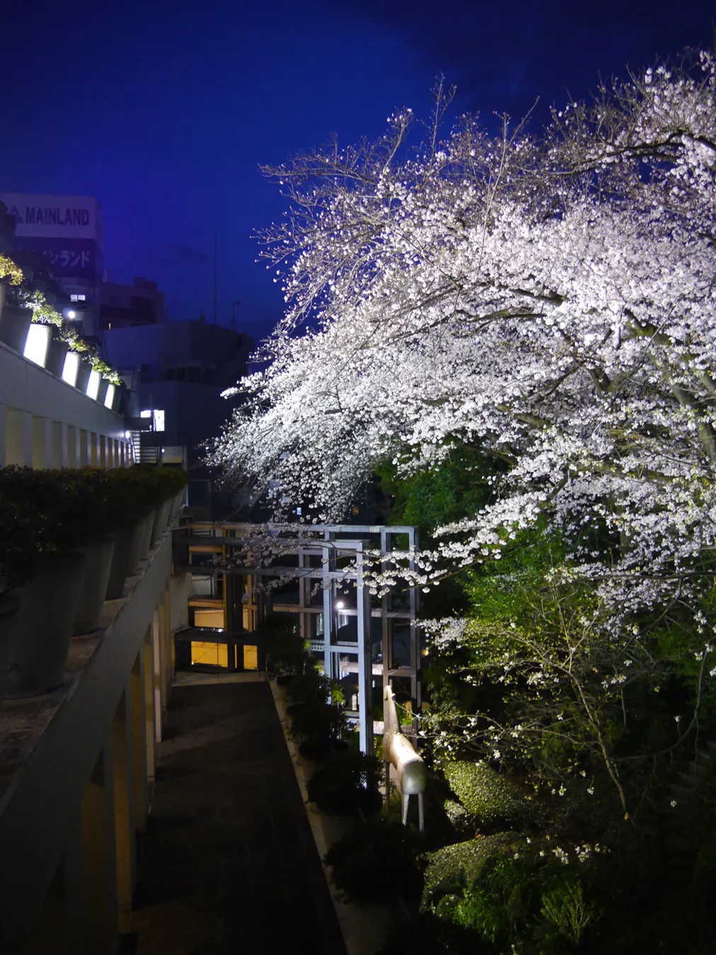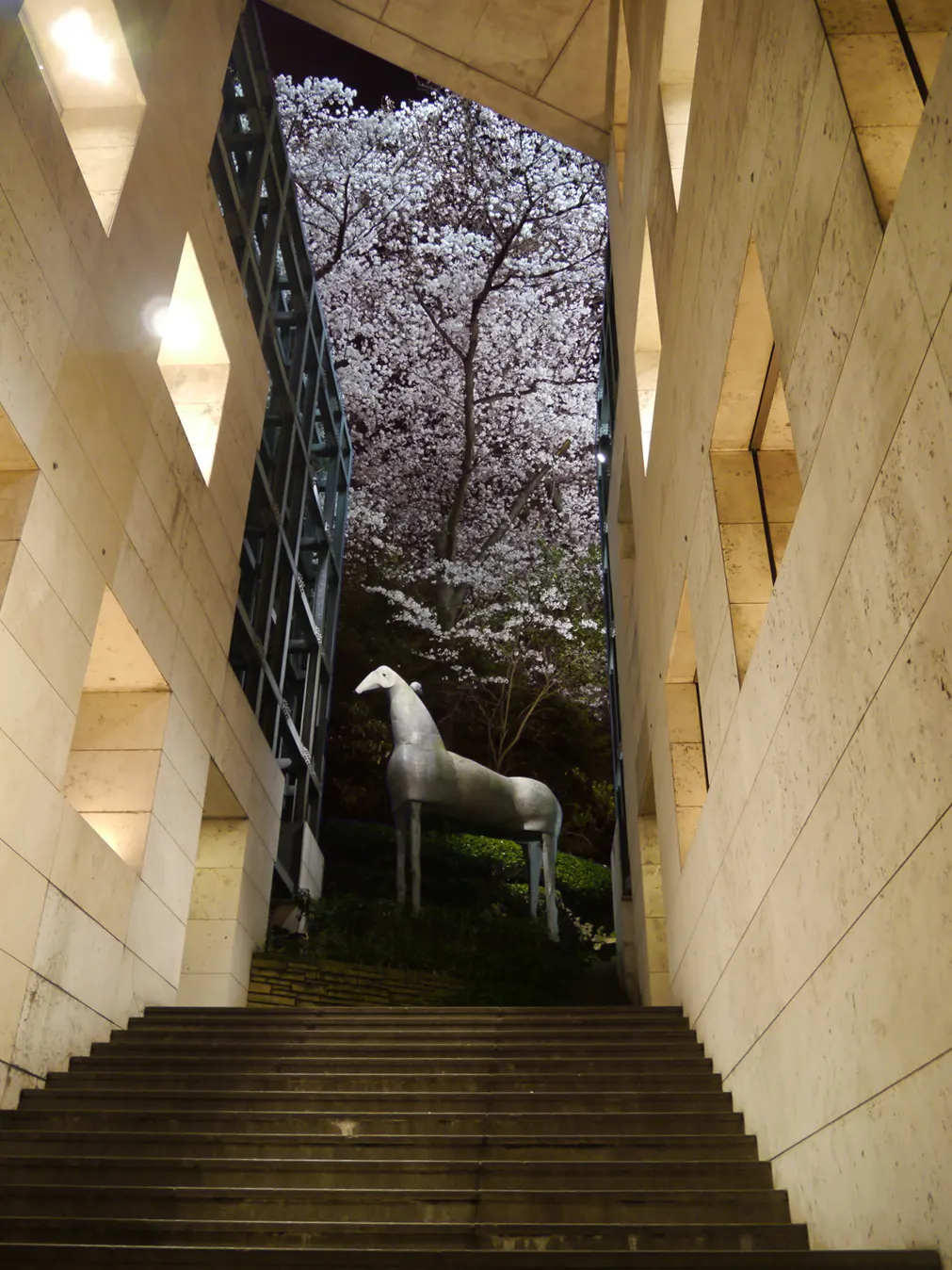 ライトアップされる東京デザインセンターの桜と馬の彫刻