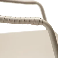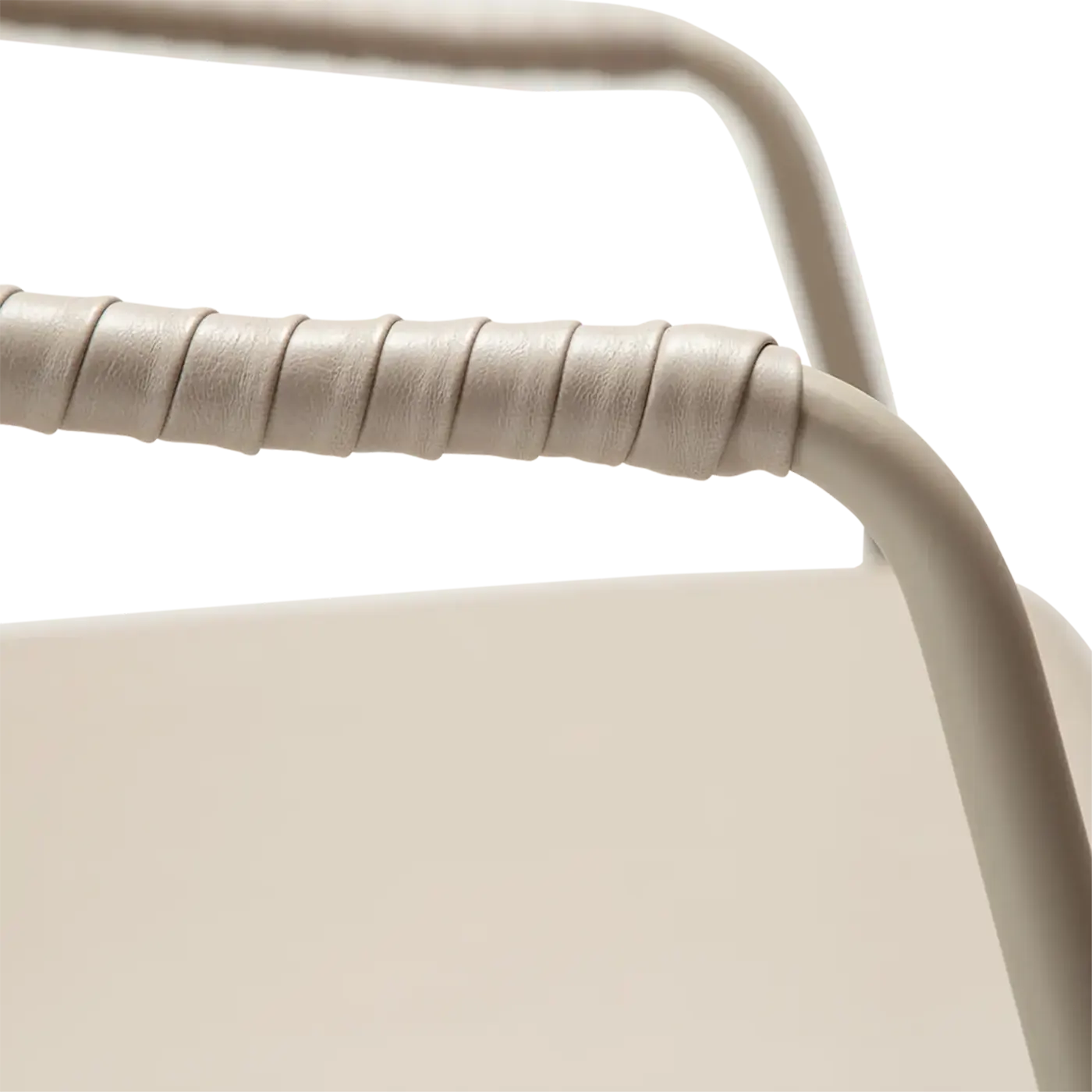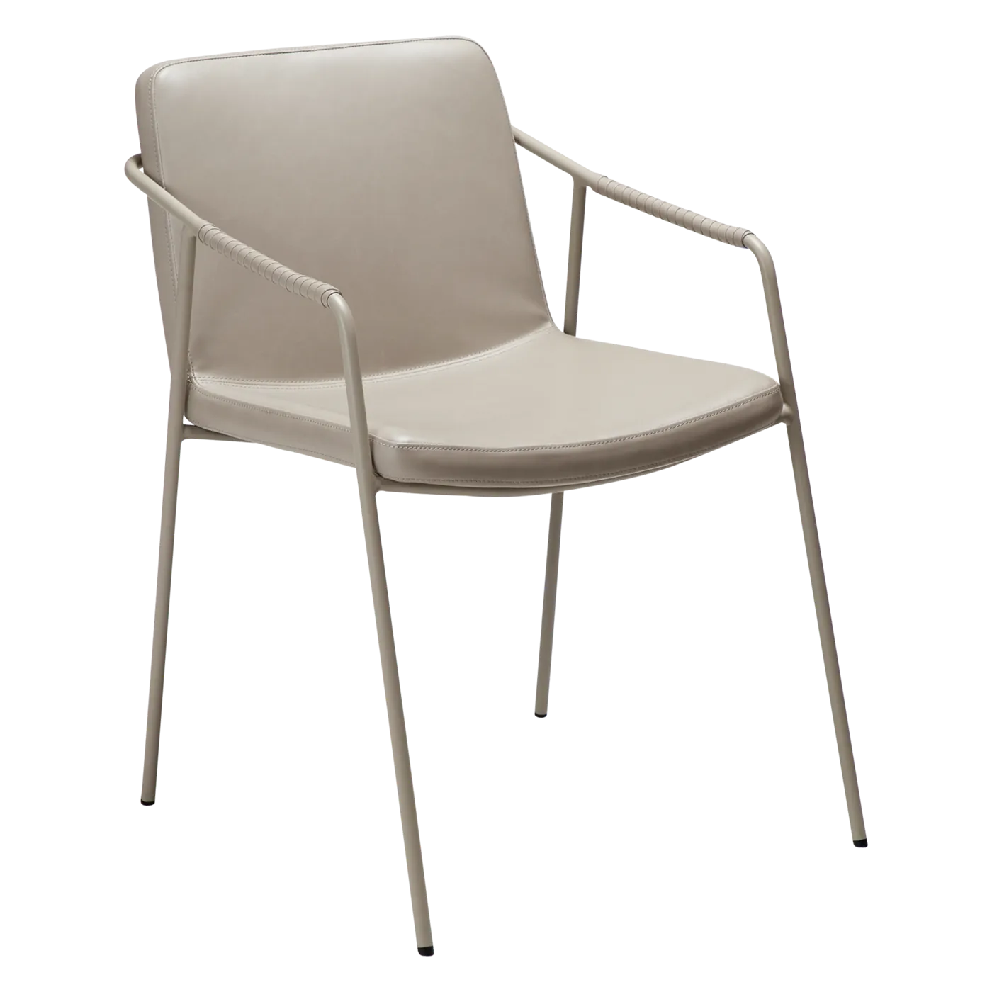 GeorgsenによるクラシックなデザインのBOTOアームチェア。アームレストに続く細い金属製の脚が背もたれをぐるりと包み込み、座面にパリッと張られた清潔感溢れるカシミア色の人工皮革はアームレストにも巻き付けられ、デザインをワンランクアップさせる装飾的なディテールとなっています。