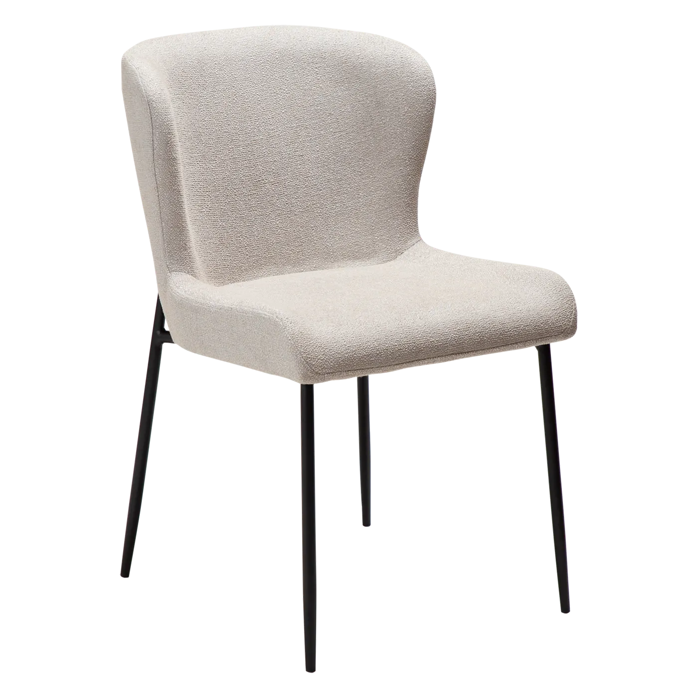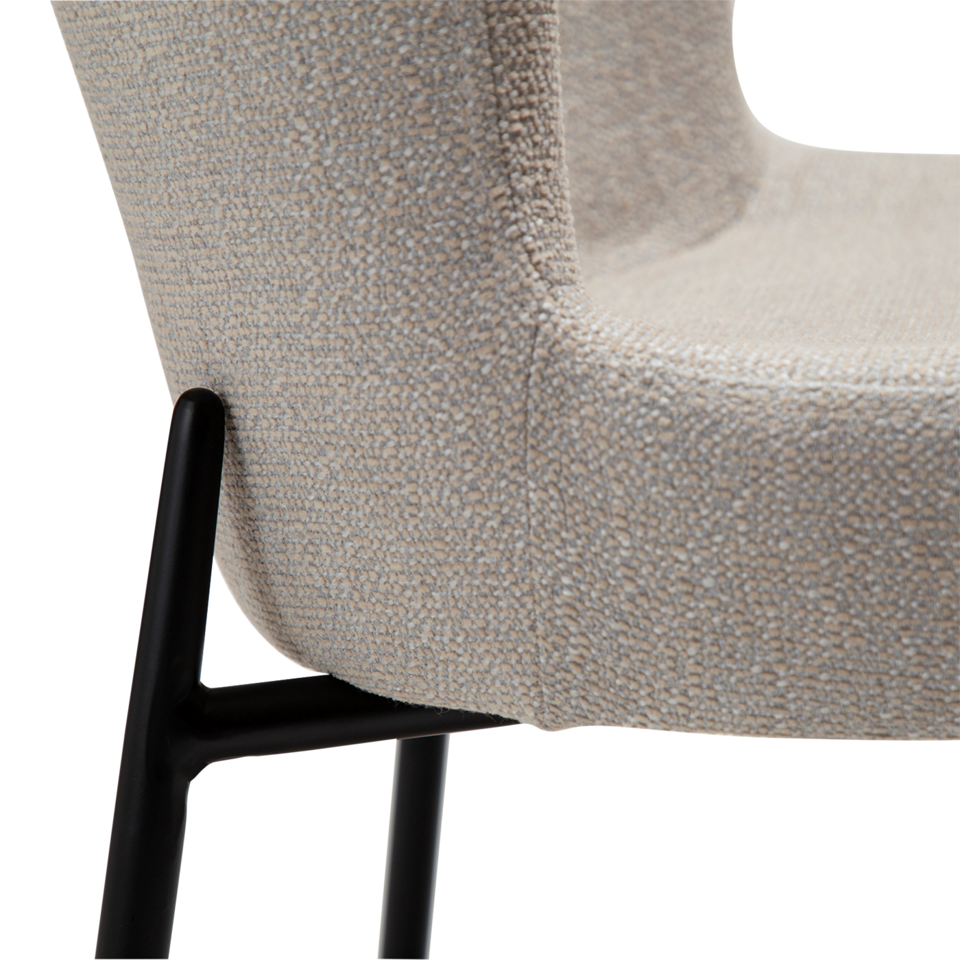 カシミア色のブークレファブリックの柔らかなフォルムの座面に、やや円錐形のスリムなブラックの脚が優雅さを漂わせ、堂々とした存在感を放つGLAMチェア。背もたれまで伸びた脚は、GLAM chairの高級感をより一層際立たせています。